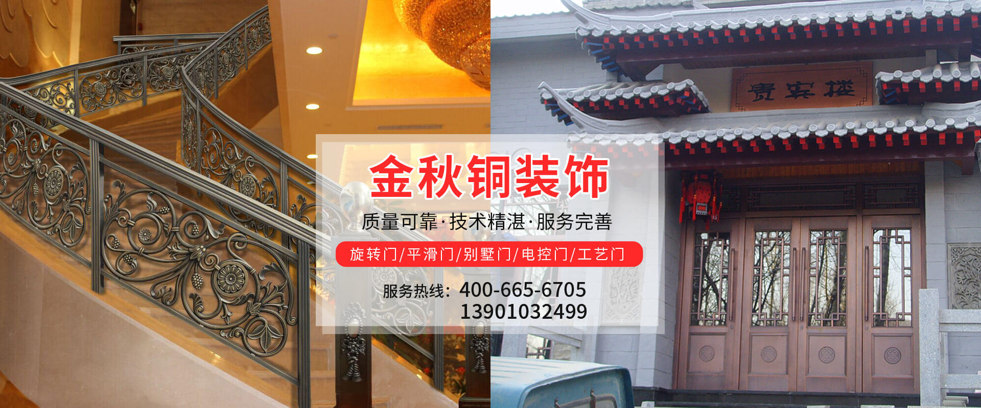 北京金秋銅裝飾材料有限公司是專業生產銅裝飾材料及設計、開發、制造、施工、售后服務為一體的大型綜合企業??沙薪咏ㄖ~裝飾工程及五星級酒店、別墅、博物館、樓樘管所等高檔銅裝飾項目;生產各種規格的旋轉門、平滑門、別墅門、電控門、工藝門、旋轉護欄、屋頂銅飾防水瓦、浮雕壁畫......